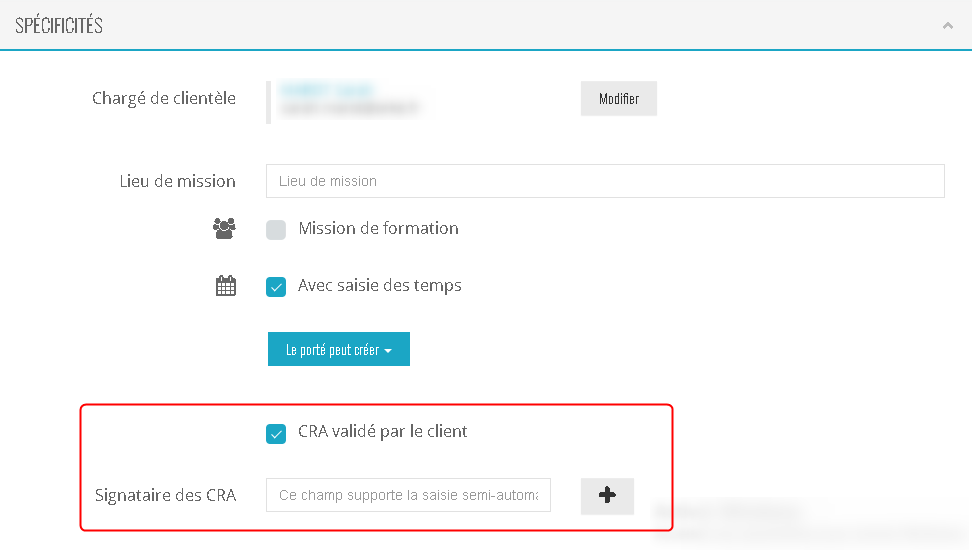 Mission > cocher le champ " CRA valider par le client " > laisser à vide le champ " Signataire des CRA "